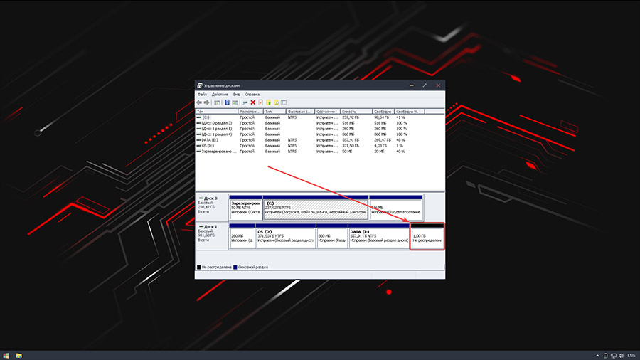 В открывшемся окне вы увидите имеющиеся в вашей системе дисковые устройства. Вам необходимо в нижней части данного окна выбрать пространство отмеченное чёрным цветом и нажать на него правой кнопкой мыши.